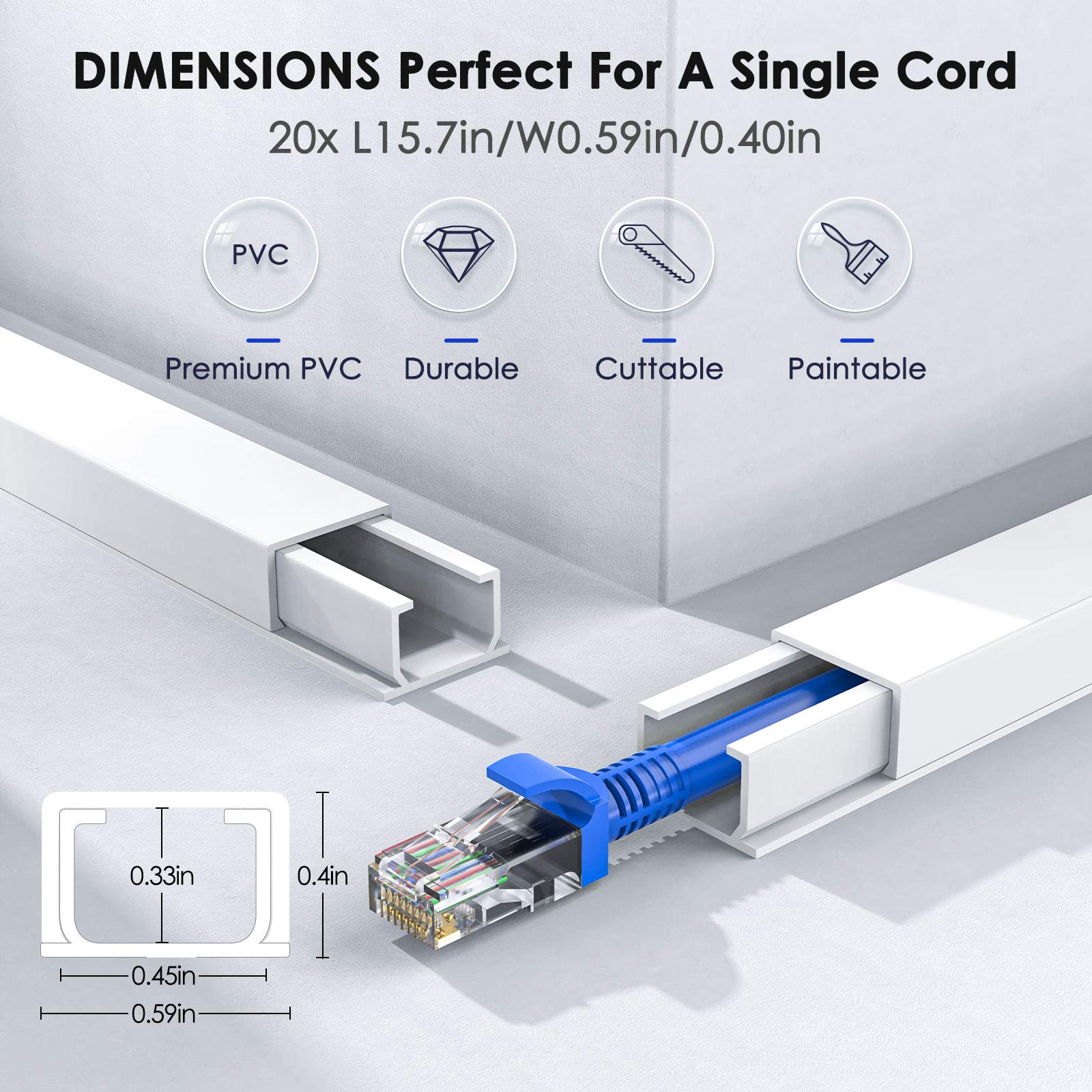 Total Length 314" Wire Covers for Cords: Includes 20 channels, each measuring 15.7" L x 0.59" W x 0.40" H. Accessories include: