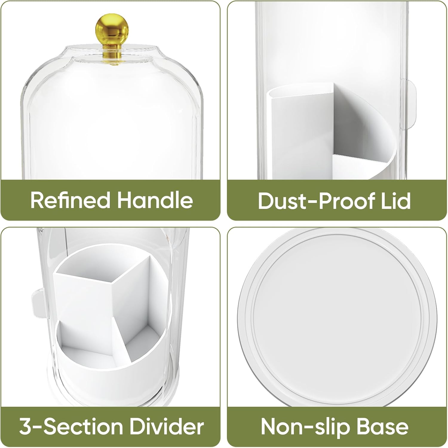 - Smart Modular Dividers: Dimensions: Despite its small footprint, the toothbrush holder boasts enough capacity.4.8*10.6 inches. Features 3 compartments, offering storage options for toothbrushes, toothpaste, makeup brushes, razors, and even dental floss.